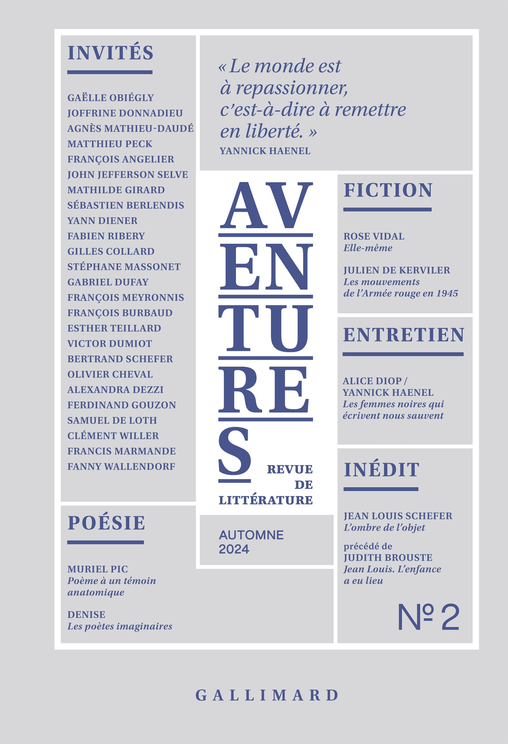 C’est aussi la passion qui anime la cinéaste Alice Diop lorsque, dans un entretien, elle nous présente une œuvre encore inédite en France de la poétesse américaine Robin Coste Lewis : Le Voyage de la Vénus noire. Passion encore, celle qui gicle comme une fontaine au cœur de la poésie, celle de Muriel Pic, celle de Denise. Passion toujours, celle que j’éprouve personnellement pour l’œuvre géniale de Jean Louis Schefer, mort en 2022, dont nous publions ici des extraits inédits du volume posthume de son journal ; ils sont précédés par une lettre que lui adresse Judith Brouste par-delà la mort. La passion est la jeunesse de l’écriture : nous ouvrons ce numéro d’Aventures avec Rose Vidal et Julien de Kerviler, deux jeunes écrivains qui vont publier leur premier roman dans la collection « Aventures » ; nous vous en proposons des extraits.
